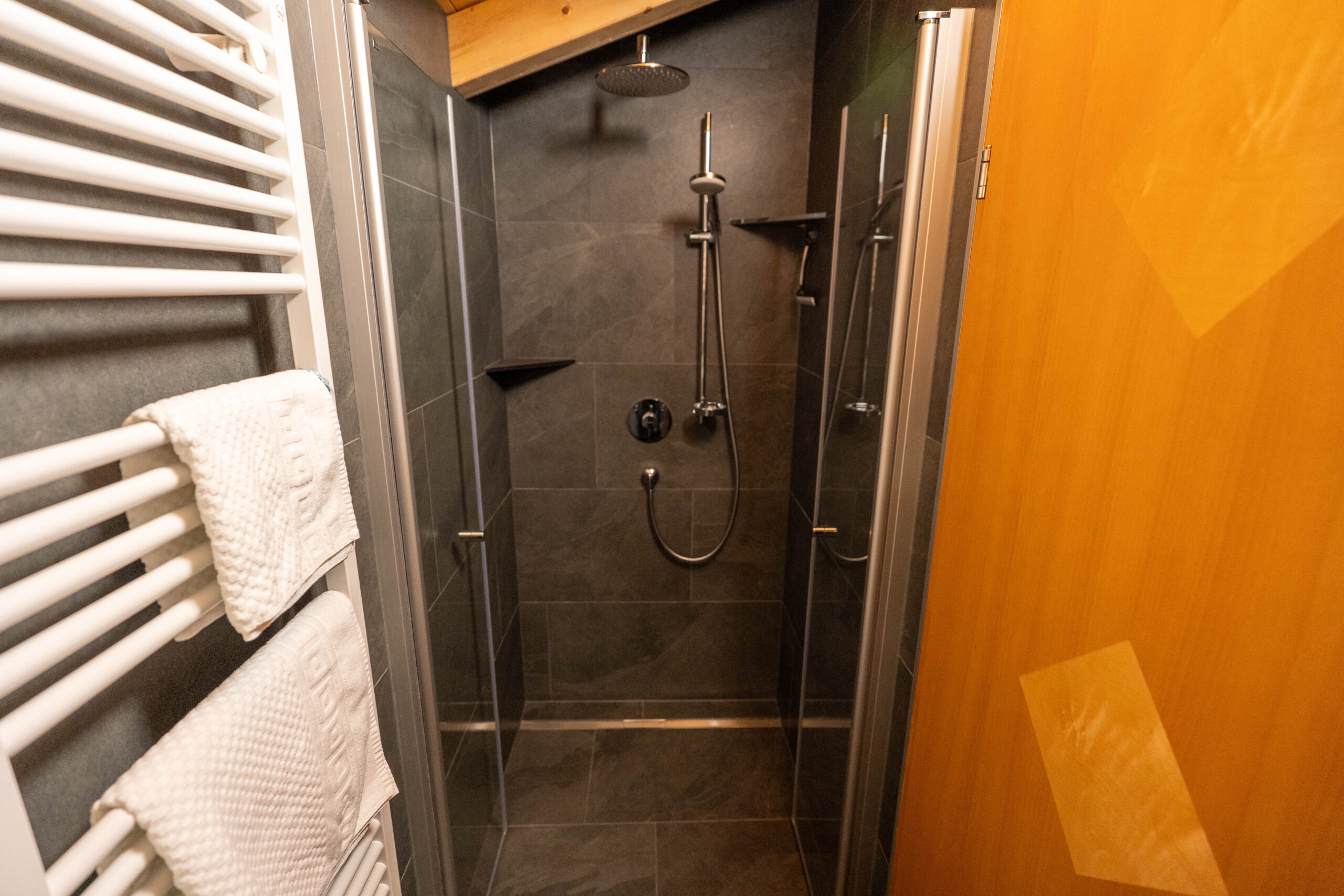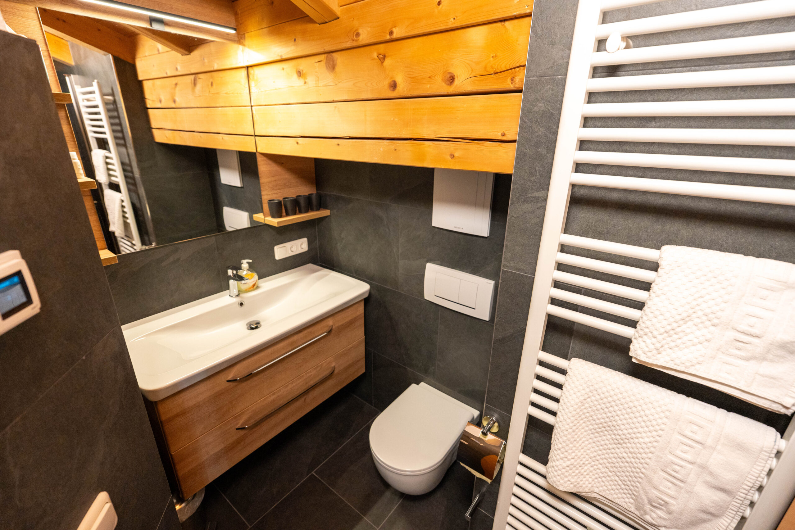 Das Badezimmer ist funktional und stilvoll gestaltet – mit allem, was Sie für Ihre persönliche Auszeit benötigen. Der südseitige Balkon bietet herrliche Ausblicke und sonnige Stunden inmitten der Bergwelt.
