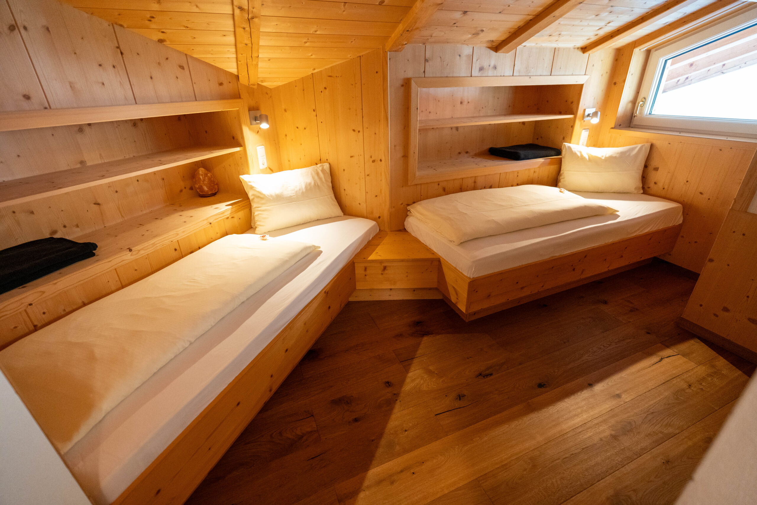 Der kombinierte Wohn- und Schlafbereich mit einem Doppelbett ist optisch abgetrennt, zusätzlich gibt es ein kleines Kinderzimmer mit zwei Einzelbetten – ideal für Familien, die Gemütlichkeit schätzen.
